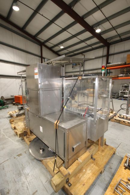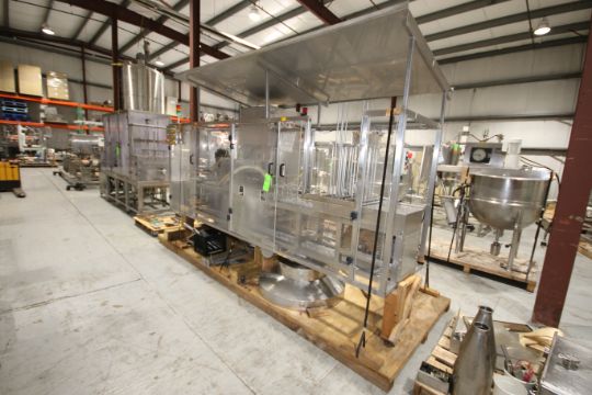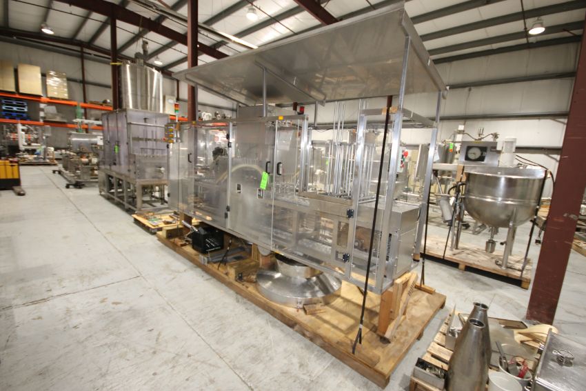 S/S 2-Lane Cup Filler, with 2-1/2" Dia. Cups, 10" L x 3" W Plates, (4) Filler Heads, with Tamper Evident Station, Overall Dims.: 142" L x 53" W x 92" H (Filler #5) (Rigging & Loading Fee $200.00) (Located in Pittsburgh, PA)