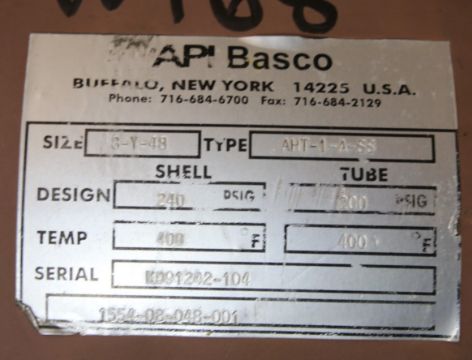 API Basco 4 ft L x 8" W Shell & Tube Heat Exchanger, with S/S Bundle, Type 8-Y-48, Type AHT-1-A-SS, S/N K091242-104, Design Psig 240, Temp 400 Degree F (W168) (Rigging & Loading Fee $50.00) (Located in Pittsburgh, PA)