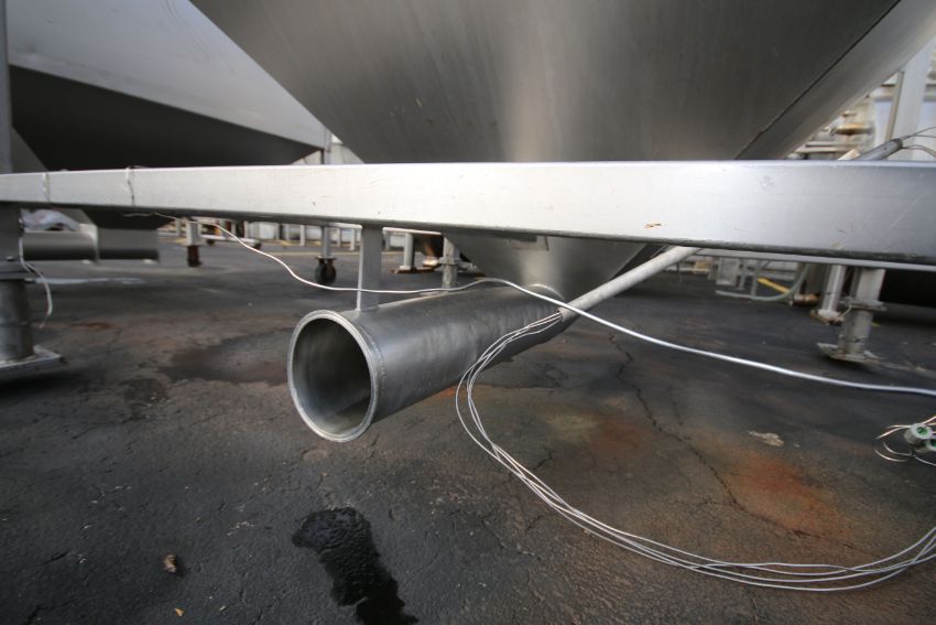 RMF 6 ft W x 6 ft L x 58" D S/S Feed Hopper, Model CT600, SN 32724, with 6" Clamp Type Discharge, Mounted on S/S Frame, (Overall Dim. 80" L x 80" W x 73" H), with Load Cells & Controller, (W888) (Rigging & Loading Fee $100.00) (Located in Pittsburgh, PA)
