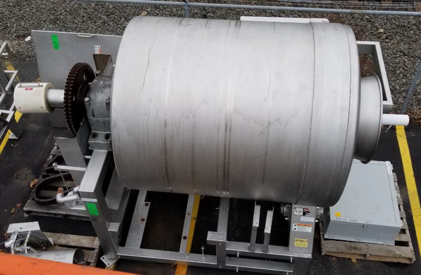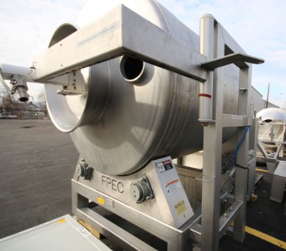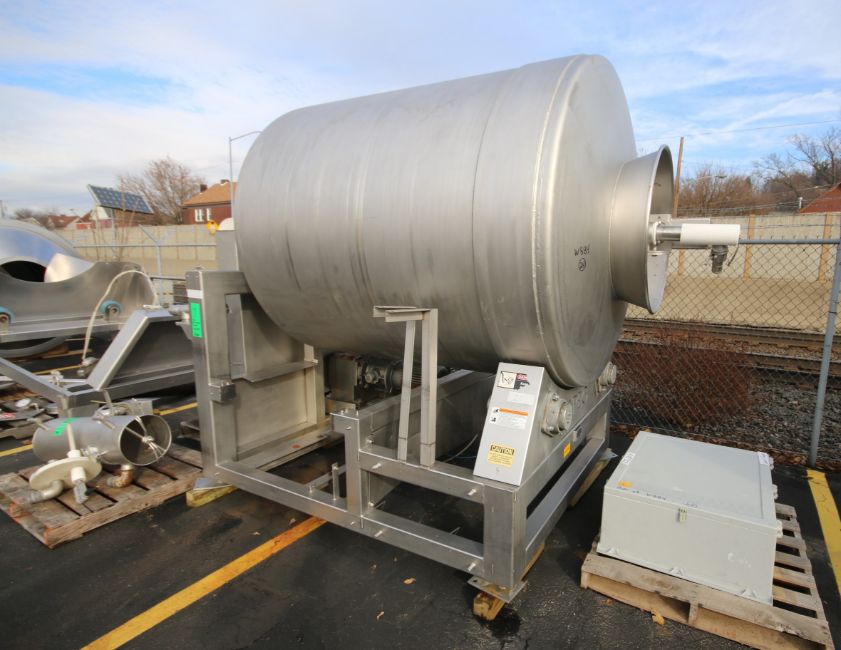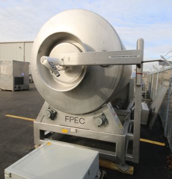 FPEC S/S Meat Massager / Vacuum Tumbler, Model VT85, SN 6242, with 70" W x 76" L Drum with Hinged Side Door, 15 hp / 1760 RPM Drive Motor, 208/230 - 460V 3 Phase, Mounted on All S/S Frame, (Overall Dim. 150" L x 102" W x 106" H), Includes Separate Control Panel with Allen Bradley Micrologix 1500 PLC Controller, Derr DVT Vacuum Pump with Canister, Includes Manuals, (W884) (Rigging & Loading Fee $1,500.00) (Located in Pittsburgh, PA)