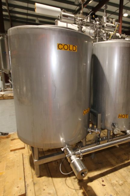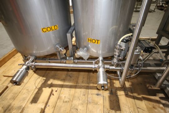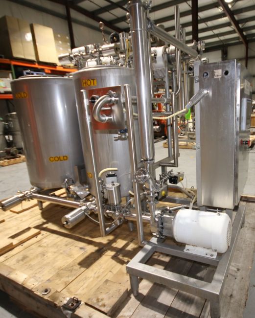 2011 Skid Mounted 2-Tank S/S CIP System, with Aprox. 230 Gal. or 48" H x 38" W Tank, 140 Gal. or 46" H x 30" W Tank, 50" L x 8" W S/S Shell & Tube Heat Exchanger, Anderson In-Line Flow Meter with Read-Out, 10 hp / 3525 rpm Centrifugal Pump, (8) Alfa Laval S/S Air Valves, Check Valves, Pneumatic Ball Valves, In-Line Filter, Level Sensors, Pressure Sensors, On-Board Control Panel with Allen Bradley Panelview 1000 Display & Solenoid Valves, (CIP Overall Diam. 112" L x 80" W x 93" H) (W552) Rigging/Handling Price: $300 *please note price does not include packaging, skidding, etc.