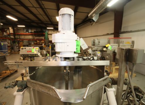 Groen 100 Gallon S/S Steam Jacketed Kettle, Model DN/TA-100, S/N 54606-1, with Bottom Inside Scrape Surface Agitator, SEW 3hp Drive Motor at 1720 rpm, 208/360V 3 Phase, Tilt Capability, Includes Hydraulic Power Pack, Max WP 100 psi @338 Degrees F, Mounted on Steel Frame (W810) Rigging/Handling Price: $300 *please note price does not include packaging, skidding, etc.
