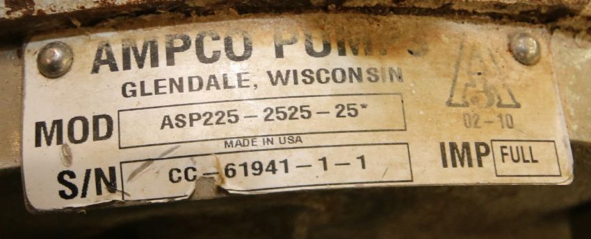 Ampco 20 HP Liquid Ring Centrifugal Pump, Model ASP225-2525-25, S/N CC 61941-1-1, with 2.5"x 2.5" Clamp Type Head, Baldor 1760 RPM Motor, 230/460V 3 Phase (W725) Rigging/Handling Price: $100 *please note price does not include packaging, skidding, etc.