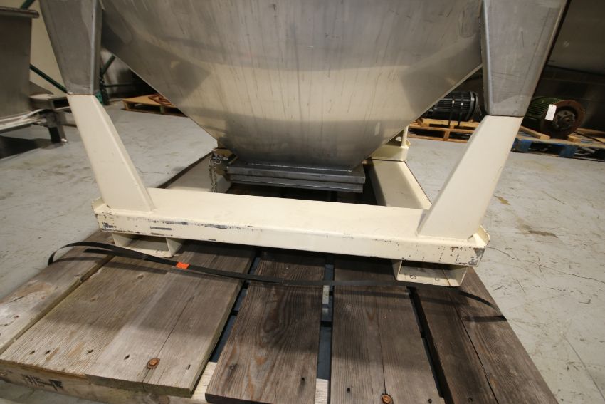 45"W x 45"L x 34"D Portable S/S Tote, with Top Access Door, 14"W x 18"L Bottom Drop Opening, Mounted on Steel Fork Attacement, with Casters (W796) Rigging/Handling Price: $75 *please note price does not include packaging, skidding, etc.
