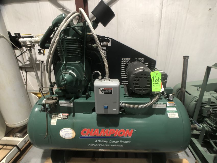 (Like New) Champion 15 hp 2 Cylinder Tank Mounted 2 - Stage Air Compressor, Model CASRSA31 / HRA15, SN D063871, 208V / 230V /460V / 60 HZ / 3 Phase, Mounted on 120 Gal Horizontal Tank, Includes Onboard Switch, Baldor Motor @ 1760 RPM, Rated for 175 psig @ 53.7 CFM, Weighs Aprox. 1,000 lbs, (2008 mfg), Tested & Runs, Aprox. Overall Dim. 74" L x 32" W x 64" H) (W300) (Rigging & Loading Fee $150.00)