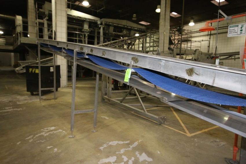 S/S Incline Conveyor, Aprox. 40' L x 28" W Hydraulic Operated with S/S Legs