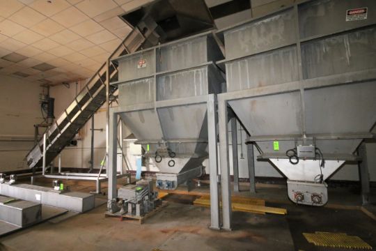 Chapman Corp. 14 ft 4" H x 9 ft 6" W x 9 ft 6" L x All S/S Cone Bottom Vegetable Accumulation Hopper, Order No. 05362, Project No. 51448, Mounted on Weigh-Tronix Digital Load Cells with SAI Model 530 Digital Read-Out, 6 ft L Dual Bottom Auger Conveyor with Electric Drive Motors, S/S Support Legs, 4 ft 7" L Infeed Separator Chute, Top Sprayer Manifold, (Interior Diam. 8 ft 5"W x 8 ft 5" L x 10 ft 4" H), (North System), (Uninstalled), Located on 3rd Floor (Located at 1080 River Avenue, Pittsburgh, PA) (Rigging Price: $5,500)