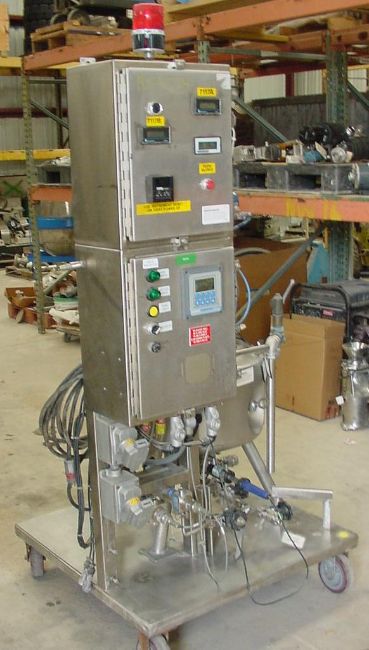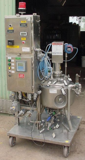 10 Gallon, Pilot Plant type reactor, Precision Stainless Sanitary reactor vessel. 316L Stainless Steel. Unit rated 75/FV @ 350 F. internal and Jacket rated 100/FV @ 350 F. Has control panel with Rosemont mdl 54 control, top mounted level gauge, valves and more. Variable speed Lightnin model P6S05R top mounted mixer. Mixer shaft has 2 sets of blades. Mounted on portable stand on wheels 36" W x 36" Deep. OAH = 80" (Located in New Jersey)