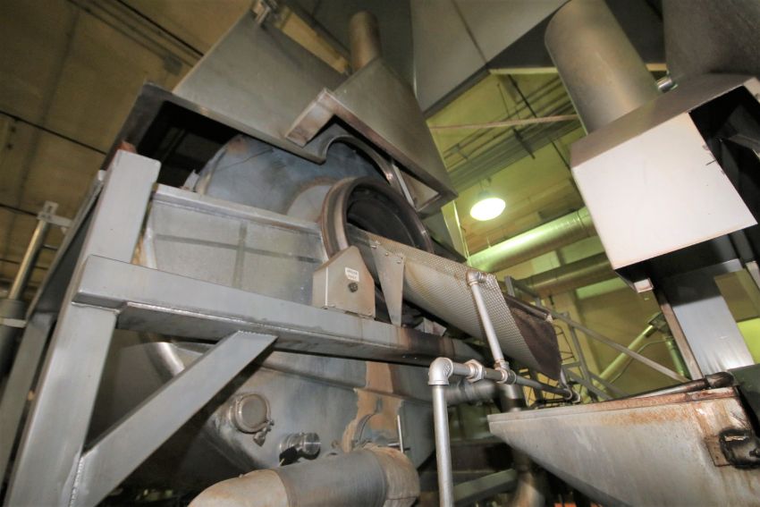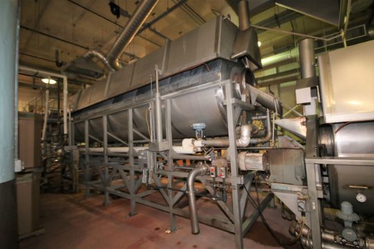 Hughes 24 ft L x 6 ft W S/S Blancher, Model 04-10016, SN 91-12116-01, Steam Heated, US 7.5 hp / 22 RPM Drive Motor, 208/230 - 460V 3 Phase, Electric Lid Leveler, Mounted on 43" H S/S Frame, Includes Related Valves & Controls, (Overall Aprox. Dim. Aprox. 28 ft L 80" W x 13 ft H)(Located at 1080 River Avenue, Pittsburgh, PA) (Rigging Price: $3,000)