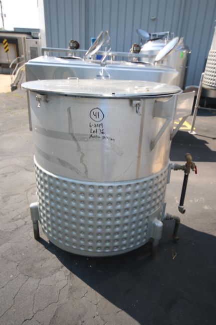 LHE 310 Gal. S/S Jacketed Vertical Tank, M/N 310GAL.CJ, S/N 6564-1, with Bottom Half Dimple Jacket, Nat'l Board Number: 1190, Jacket 50 MAX. PSI @ 300 F, Shell Thickness .109, Mounted on S/S Legs, Overall Dims.: Aprox. 52" H x 51" Dia. (Rigging & Loading Fee $150.00)(Located in Pittsburgh, PA)