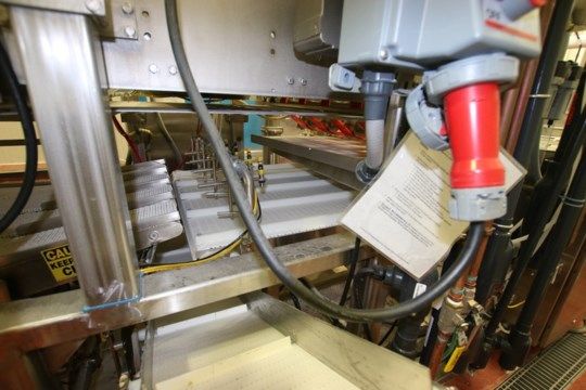 Barry Wehmiller / Thiele / Forpak Sheet Inserter / Dough Stacker, Model - Reciprocating Placer, SN T7300A414, 4 - Lane Design, with 38" W Intralux Infeed Conveyor, Includes STI 9 ft 10" L S/S Out-Feed Product Conveyor with 4 - Lane Design @ 8" W Intrulux Conveyor, Running Into 32" W Adjustable Single Filer Section with (6) 1/ 3/4 hp S/S Clad Drive Motors, 208/230/460V, Includes 39" x 8" Outfeed Conveyor, (2) S/S Control Panels with Allen Bradley Compact Logix PLC Racks, (1) with 5561 PLC Card, Panelview 1250 Display, (2) Powerflex 700 VFD's, Ultra 3000 Servo Drives, 460V 3 Phase, (Stacks & Inserts a Pad Between Two Sheets of Cookie Dough), (W425) (Rigging & Loading Fee $500.00) (Located in Pittsburgh, PA)