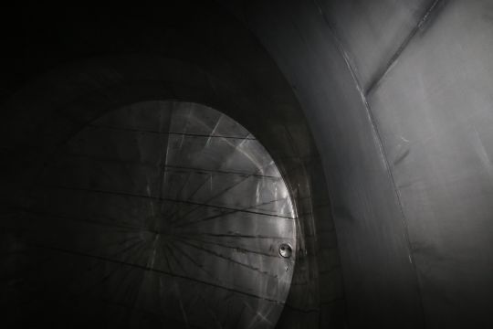 { Choice of lots: 104, 105, 106, 107, 108, 109, 110, 111, 112, 113, 114, 115, 116, 117 (P) } 150,000 Gal. Single Wall S/S Holding Tank, Aprox. 32' Dia., with Side Man Hole & S/S Butter Fly Outlet Valve, Overall Height: Aprox. 31' 6"
