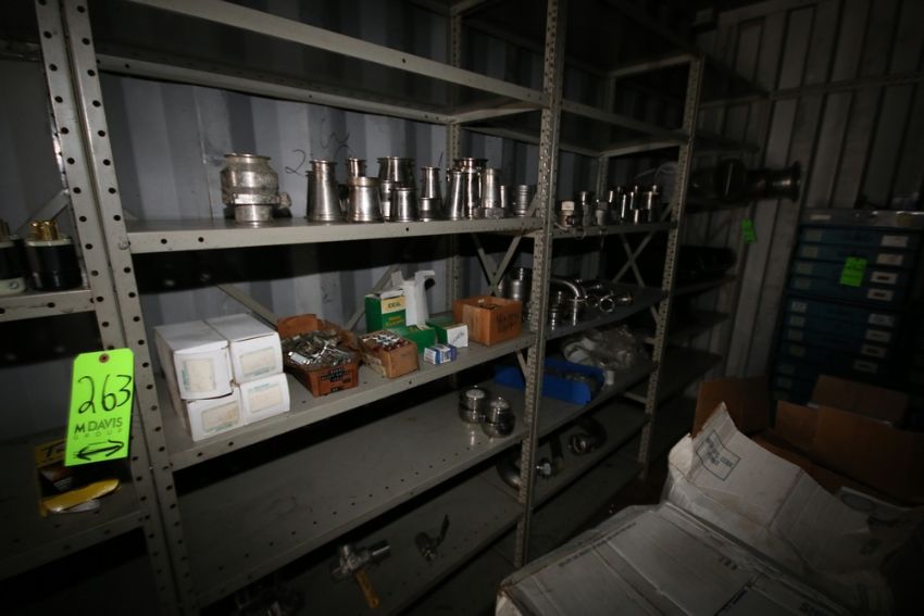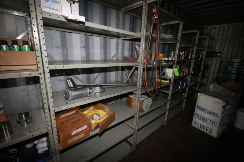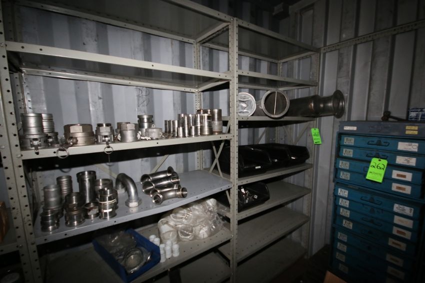 6-Shelving Units with Contents, Includes PD Pump Propeller, Actuated Ball Valves, Threaded S/S Fittings, Other S/S Filters, Pressure Gauge, and Other Present Contents Associated with Lot