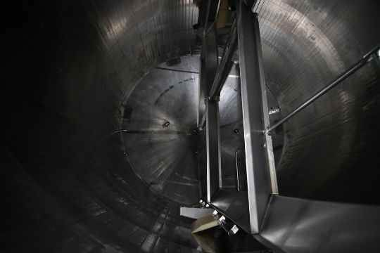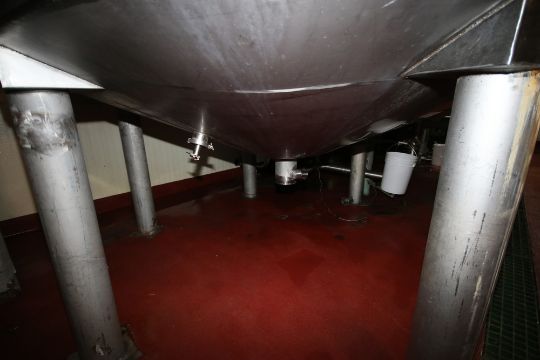 C.E. Howard 6,000 Gal. S/S Jacketed Vertical Mix Tank, S/N U1601B, with Ammonia Jacket, Aprox. 116" Dia., Dome Top/Cone Bottom, with S/S Wide Sweep Agitation, CIP Spray Ball, with Hydraulic Driven Agitation Motors, Mounted on S/S Legs, Overall Heigth: Aprox. 20' Tall