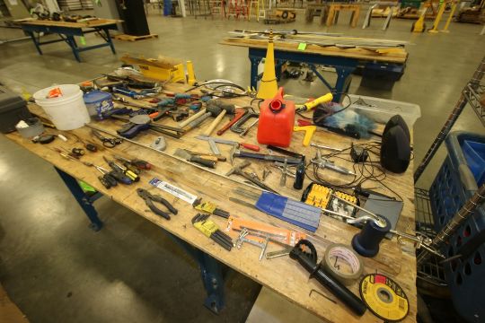 Lot of Assorted Tools, Including Screw Drivers, Saws, Quick Grip Clamps, Hammers, Laundry Baskets, Bungie Cords, Portable Wire Rack, Air Hoses, Safety Vests, Hard Hards, Gas Cans, Ohaus Digital Scale, and Other Present Contents As Photographed