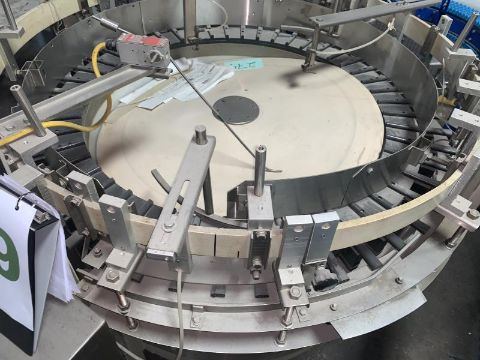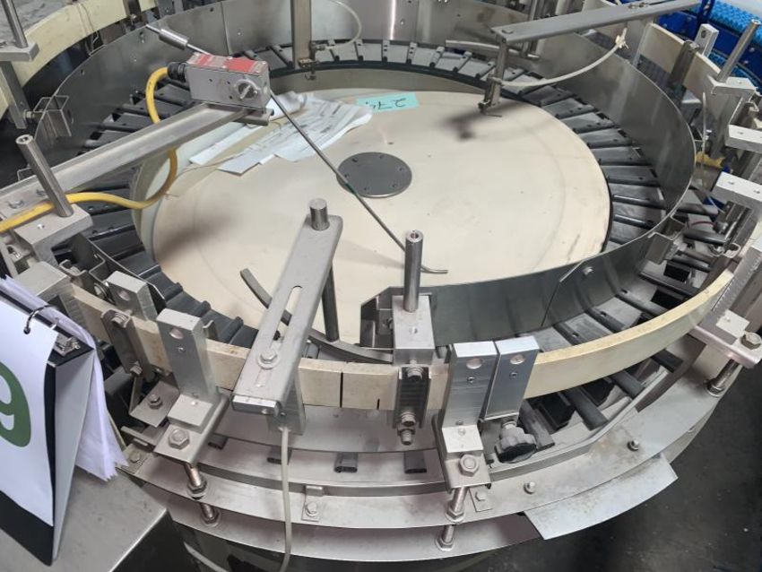 Hopmann Bottle Unscrambler bottle erector stainless steel with 4.5" wide outfeed belt conveyor. (Rigging and loading fees included in the selling price - optional Palletizing $85.00)