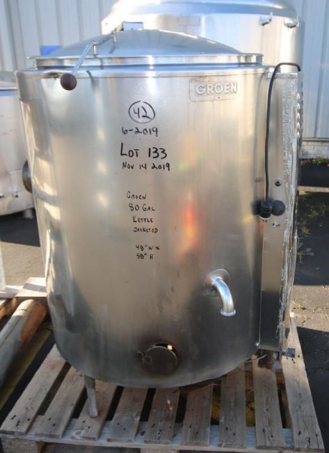 Groen 80 Gal. S/S Jacketed Kettle, Model AH-80 234N, SN 37444, Hinged Lid, 1.5" Connections, Electric & Natural Gas Heated, 115V, 135,000 btu hr, (Aprox. Overall Dim. 48" W x 58" H) (Rigging, Loading & Site Management Fee $250.00)(Located Pittsburgh, PA)