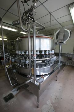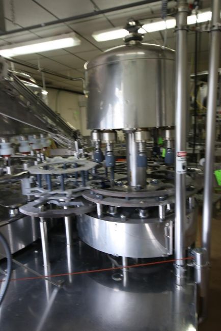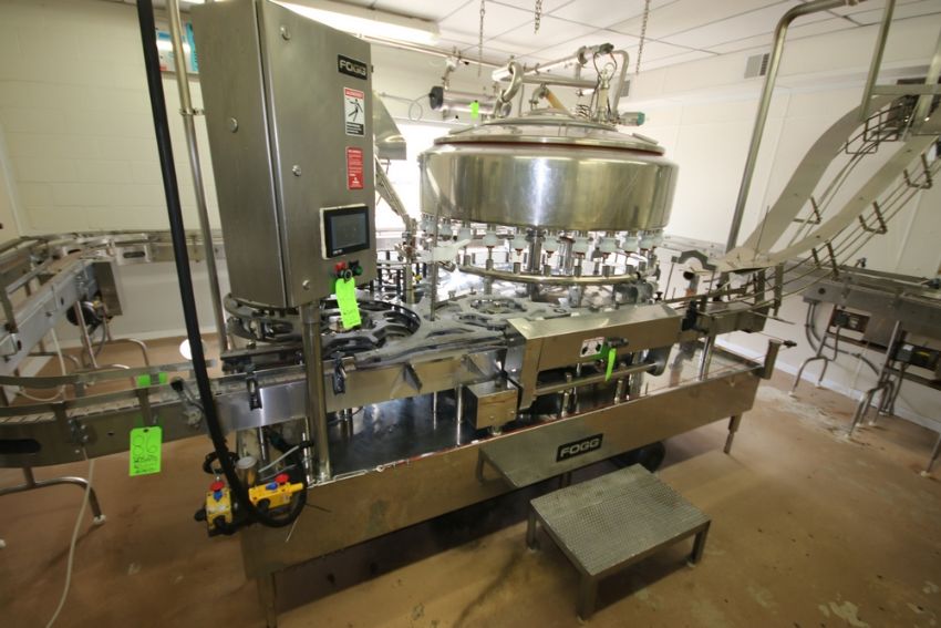 { Group of lots: 84, 85 } Fogg 32-Valve Rotary Gallon & Half-Gallon Filler with Complete CIP Ring and CIP Pump, S/N 715-1-4-99-LH, with (8) Head Rotary Capper, with Fogg Cap Feed System, S/N 621-71-4-99, Overall Filler Dims.: Aprox. 124" L x 91" W x 103" H, with (2) Inlet Air Valves, with 10 hp Centifugal Pump, with Baldor 3500 RPM Motor, Includes Manual (New/Never Used Half-Gallon Eagle Claw Style Elevator Bottle Feed Line; Was Running 115 GPM) (DA)