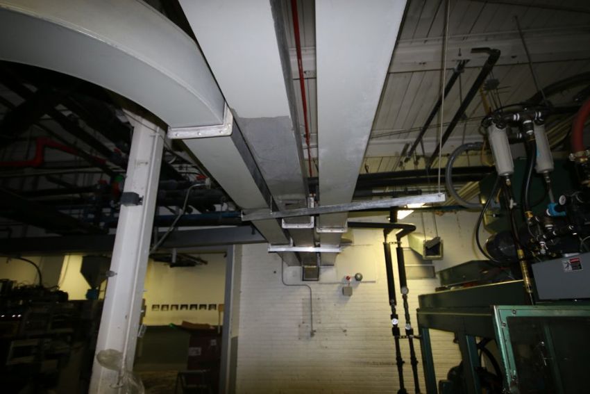 Aluminum Overhead Regrind Chutes Running Overhead in High Density Room, Includes Straight Sections & Alpines, Bends, Drives, Gallon & Half Gallon (BM)