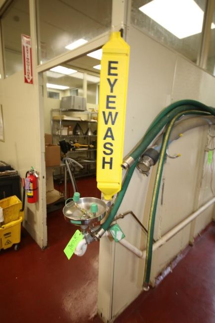 Remaining Contents of Tank Room, Including (2) Aluminum Dunnage Racks, (1) Wall Mounted Aluminum Shelf, (1) Brush & Apron Rack, (2) Emergency Eye Wash Stations