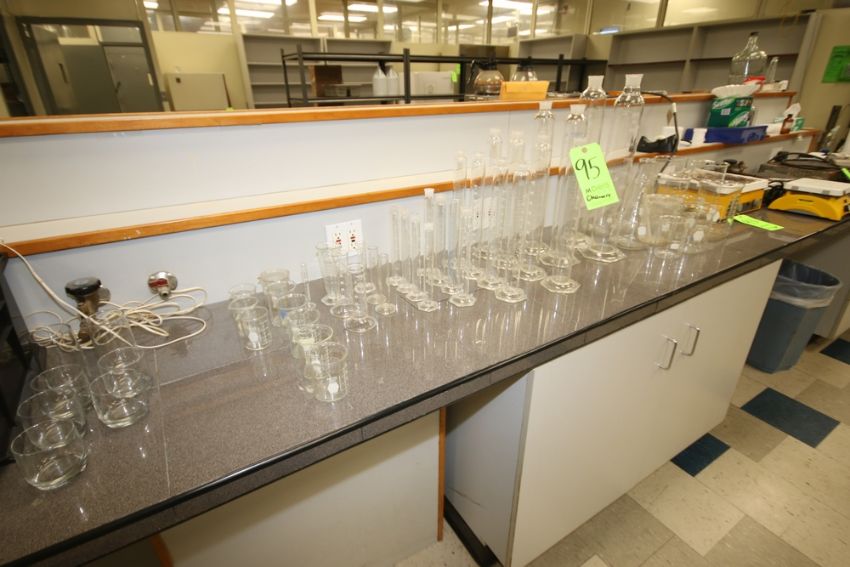 Assorted Lab Glassware, Approx. 45 pcs, Includes Graduated Cylinders, Beakers, Beakers, and Other Present Glassware As Photographed