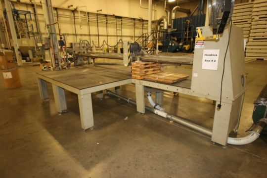 Hendrick 22" Dia. Cross Cut Saw, M/N HS 150, S/N 29081, with Laser Assist, Aprox. 136" W Cutting Area, with Inlet & Discharge Tables, 230 Volts/3 Phase, Includes Central Machinery 2 hp Dust Collector (Saw #2)(LOCATED IN LEETSDALE, PA) (MUST BE REMOVED BY 12/31; CALL OFFICE FOR RIGGING INFO. 412-521-5751)