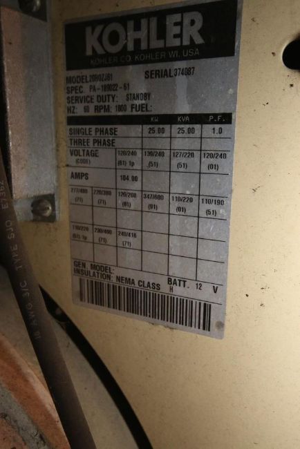 Kohler Fast Response Stand-By Generator, M/N 20ROZJ61, S/N 374087 ***SOLD SUBJECT TO SELLER CONFIRMATION*** (LOCATED IN BROCKPORT, N.Y.) & (CONTACT GARY ROGERS WITH AWR RIGGING FOR RIGGING CHARGES 585-737-7000 gary@dockhardware.com) &