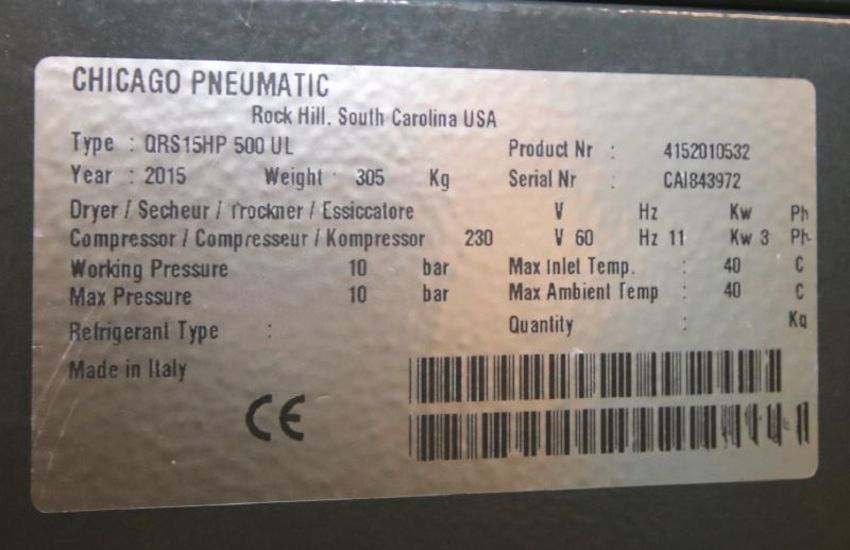 2015 Chicago Pneumatic 15 hp Screw Air Compressor, Type QRS15HP 500 UL, SN CAI843972, Mounted on 64" L x 24" W Horizontal Receiver, 145 working psi (10 bar), 7,549 Metered hrs, 208/230/460V 3 Phase (Located Pittsburgh, PA)(Rigging, Handling & Site Management Fee $450.00)