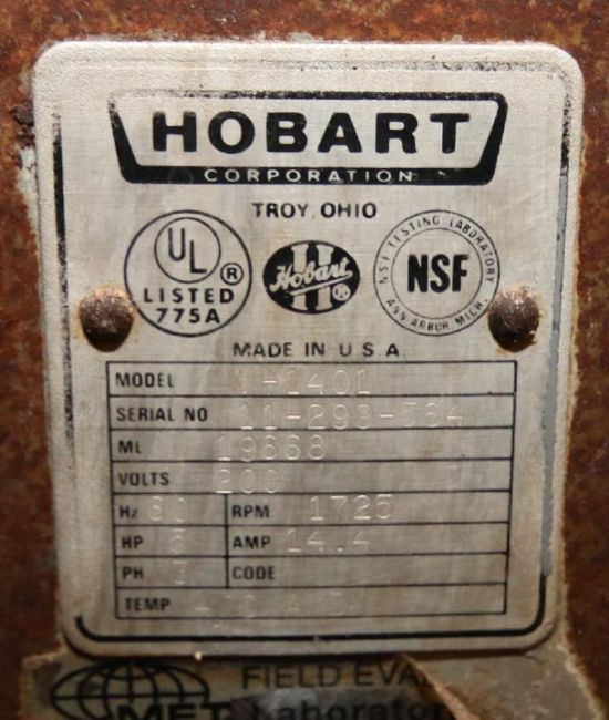Hobart 140 Quart Dough Mixer, Model V1401, SN 11-299-564, 5 hp, 1725 rpm, 200V 3 Phase, (Note: Bowl & Accessories Not Included) (Located Pittsburgh, PA) (Rigging & Loading Fee: $300)