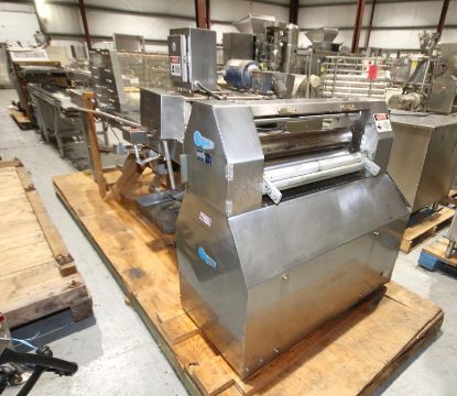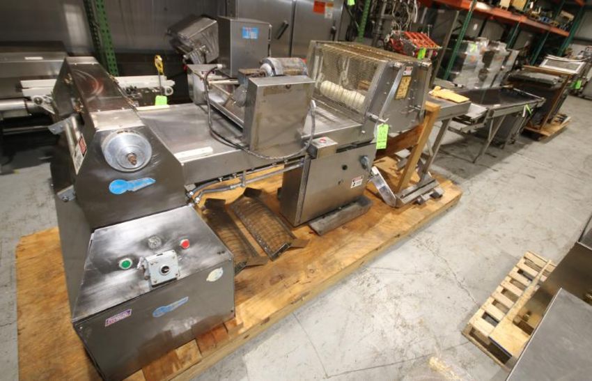 Moline 24" S/S Dough Sheeting Line, Model FB - 24, SN FB - 90 - 360, 11 ft L Section Includes 24" W Roller, Teflon Roll Cutter, 10 ft 4" L Cutting Station / Conveyor, Model EDU - 24, SN EDU 90 - 244, 11 ft L Conveyor Section, Model EDU - 24, SN EDU - 90 - 245, 220V 3 Phase(Located at the MDG Showroom in Pittsburgh, PA) (Rigging & Loading Fee: $700)