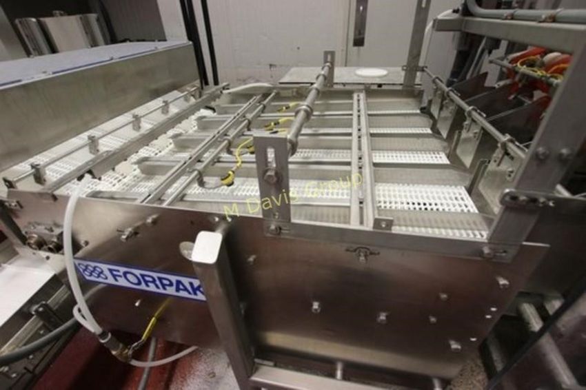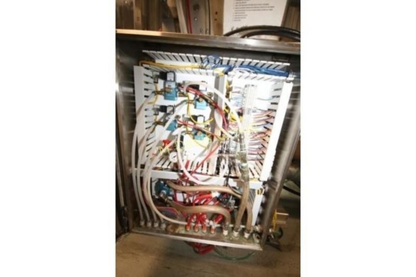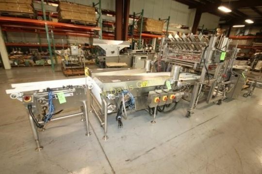 Barry Wehmiller/Thiele/Forpak Sheet Inserter / Dough Stacker, Model - Reciprocating Placer, SN T7300A414, 4 - Lane Design, with 38" W Intralux Infeed Conveyor, Includes STI 9 ft 10" L S/S Out-Feed Product Conveyor with 4 - Lane Design @ 8" W Intrulux Conveyor, Running Into 32" W Adjustable Single Filer Section with (6) 1/ 3/4 hp S/S Clad Drive Motors, 208/230/460V, Includes 39" x 8" Outfeed Conveyor, (2) S/S Control Panels with Allen Bradley Compact Logix PLC Racks, (1) with 5561 PLC Card, Panelview 1250 Display, (2) Powerflex 700 VFD's, Ultra 3000 Servo Drives, 460V 3 Phase, (Stacks & Inserts a Pad Between Two Sheets of Cookie Dough), (Located in Pittsburgh, PA)