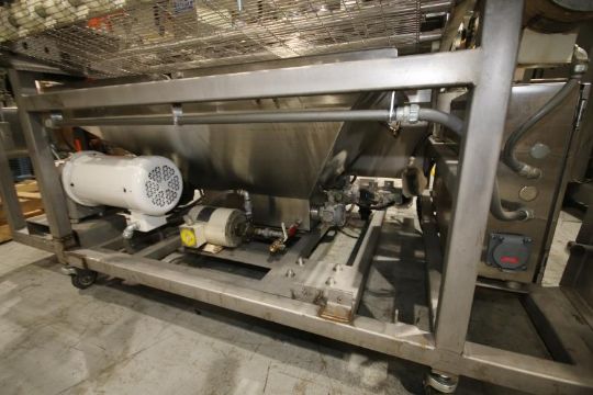 Inline Donut Half Icer/Icing System with S/S Conveyor with Hopper, Includes 44" W x 66" L x 38" H Conveyor with Wire Mesh Belt with 1/2 hp / 1740 rpm Drive Motor, 230 / 460V 3 Phase, Hinged Plexiglass Top Cover, Includes Fedco Bottom Portable S/S Hopper, Model 1B-44-00, SN 202149, with 49" L x 49" L Hopper with Mounted Waukesha Positive Displacement Pump, Model 045U2, with 5 hp / 1750 rpm, 230 / 480V 3 Phase, with Controls (Located Pittsburgh, PA)