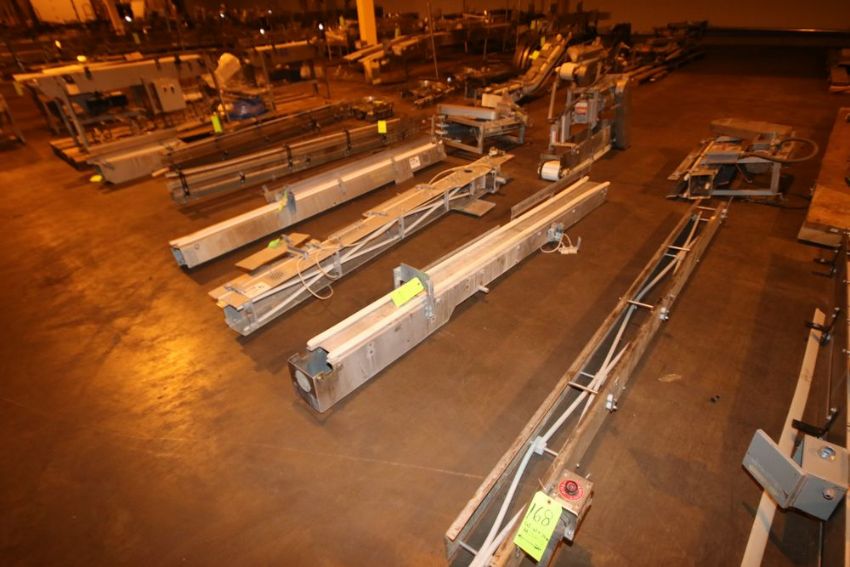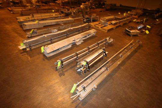 Large Assortment of S/S Product Conveyor, Includes Straight Sections, Curve Sections, Bottle Orientation, Dual Lane Conveyor, "S-Type" Conveyor, Width Range: 3-1/2"-13" W (NOTE: Most Missing Belts & S/S Legs--See Photographs) (LOCATED IN BROCKPORT, NY) (NOTE: SUBJECT TO CONFIRMATION)