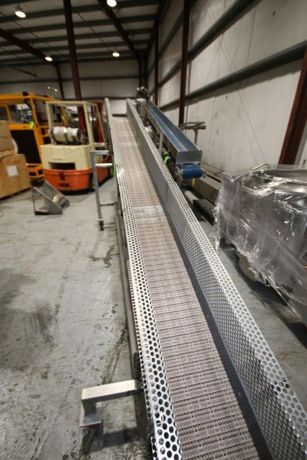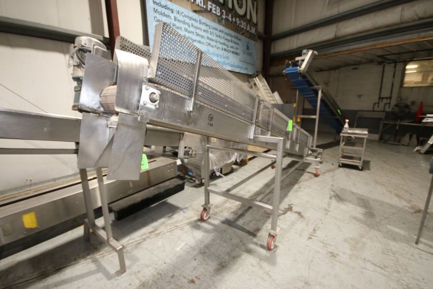 S/S Incline Conveyor, with Sterling 1 hp S/S Clad Drive, Mounted on S/S Portable Frame, with Aprox. 11" Plastic Belt , Overall Dims.: Aprox. 180" L x 38" W x 66" H (LOCATED @ M. DAVIS GROUP AUCTION SHOWROOM--PITTSBURGH, PA) (Rigging, Handling & Site Management Fee: $250.00)