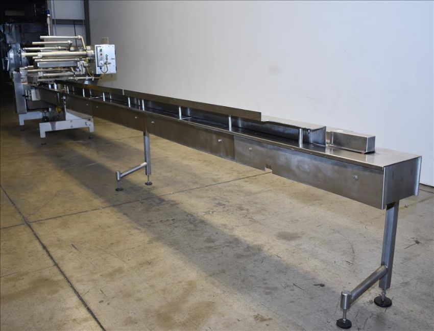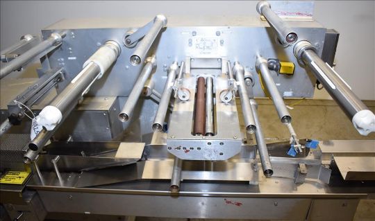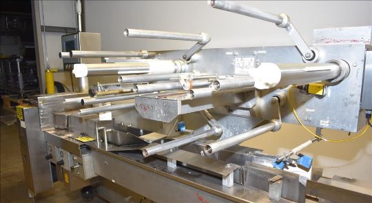 Used- Delta Systems S/S Flo Wrapper with Koyo Direct Logic 205 PLC Controls, with HMI interface Estimated rate of 100 ppm. Has Indramat Servo controllers, CE certified. Includes 16' long lugged chain currently set up on 12" adjustable centers with carrier chain. Has dual web arbors with spice table, film registration. Has maximum product height of 3", 1 up 10" wide seal jaws with longitudinal serrations. 40" long discharge belt with air blow off for empty pouches. Current former is 4.75" wide x 3" high. 71925001(Located in IL) (Note: Rigging Fee $250.00)