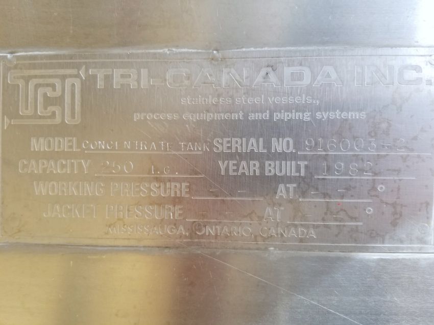 Tri-Canada 250 Gallon Vertical Mixing Tank, Serial: 916003-2, Top Mounted .43HP Lightnin Agitator with 1750 RPM, 115/230 Volt, Dome Top with Cone Bottom, Top Manway, Stainless Steel Legs (Located in North Carolina) (Note: Removal and Loading Fee $500.00)
