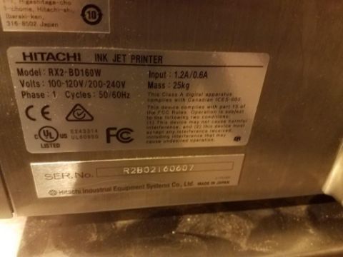 Hitachi RX2-BD160W Small Character Ink Jet Printer, Model RX2-BD160W, S/N R2B02160607, 120V (Located in Sioux Falls) (NOTE: RIGGING & LOADING INCLUDED IN SALE PRICE -- PACKAGING IF REQUIRED, AVAILABLE FOR ADDITIONAL FEE)