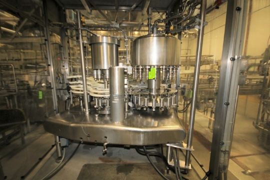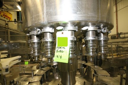 Federal All S/S 18 Valve HEPA Enclosed Bottle Filler: Set up for PET Bottles with 8 Head Screw Capper; 38MM Caps S/N R1201S18D8RG664 with Palace Vacuum Cap Sorter and Rotary Cap Feeder with Cap Chutes: Screw Type Bottle Infeed: Includes Dedicated CIP System with S/S Shell and Tube Heat Exchanger, Fristam Pump and 6 Air Valves; HEPA Filter Blower Controls are Allen Bradley Panel View 600 Plus with MicroLogix 1500 PLC; Change Parts included for 16oz Round, 32oz Round, 59oz Square, and 64oz Square (Located in Wisconsin)