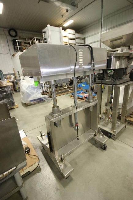 Sure Kap S/S Capper, M/N SK600, S/N PA15717, with (3) Spare Belts, with Operating Manuals, Mounted on S/S Portable Frame, Includes Sure Kap S/S Cap Feeding Hopper, M/N SK6000-SP, S/N PA19017, Mounted on S/S Portable Frame (LOCATED IN BEAVER FALLS, PA) (Rigging, Loading & Site Management Fee: $350)