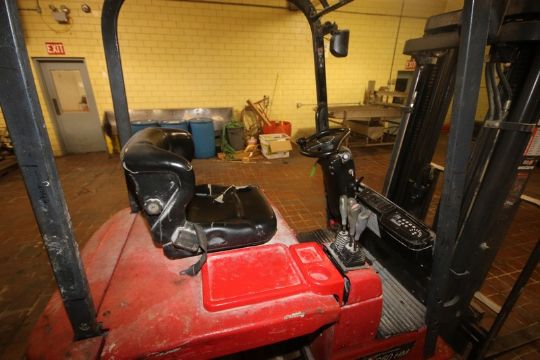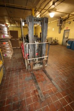 Raymond 5,000 lbs. Sit-Down Electric Forklift, M/N 470-06-HM00006, with 3-Stage Mast with Side Shift, Aprox. 42" L Forks with Cage (NOTE: Missing Battery--See Photographs)(RIEKES EQUIP. TEST RESULT: No Function At All; Unit Will Not Power Up) (LOCATED IN GRAND ISLAND, NE) (Rigging, Handling, & Site Management Fee: $350.00 USD)