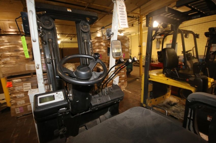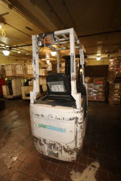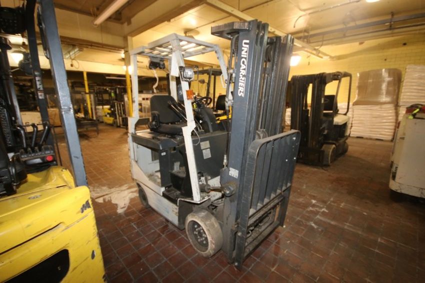 Uni-Carriers 2,250 lbs. Electric Sit-Down Forklift, M/N MCJ1B1L18S, Chassis No. CJ1B1-991068, with 3-Stage Mast with Side Shift with Cage (NOTE: Missing Forks & Battery--See Photographs)(RIEKES EQUIP. TEST RESULT: 7,646 Hrs.; Unit Powers Up/Lifts/Lowers/ Drives F & R; Codes 453) (LOCATED IN GRAND ISLAND, NE) (Rigging, Handling, & Site Management Fee: $350.00 USD)