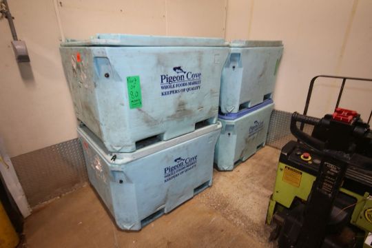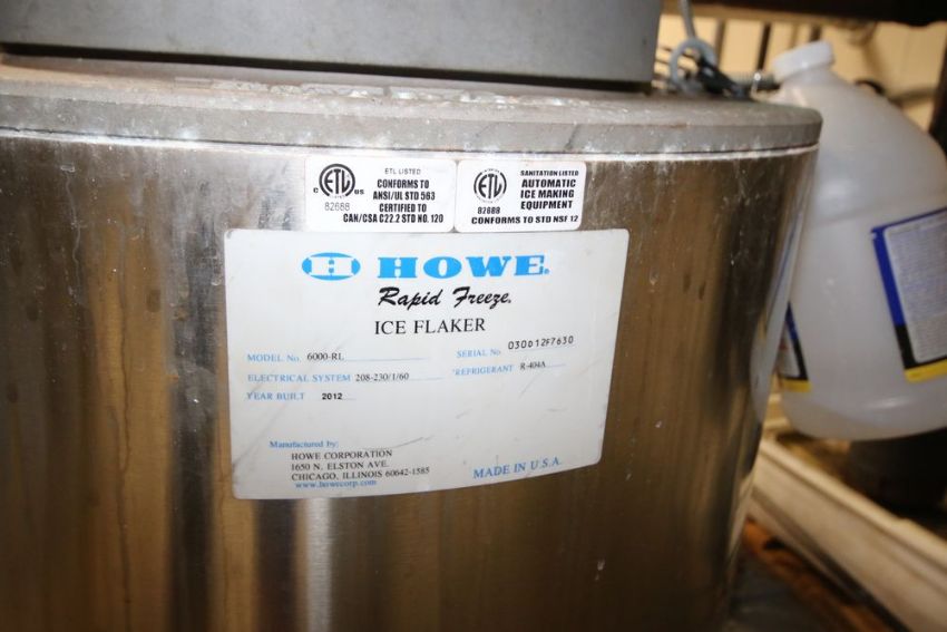 2012 Howe Rapid Freeze Ice Flaker, M/N 6000-RL, S/N 030D12F7630, R-404A Refrigerant, 208-230/1/60 Electrical, with Marathon 1/2 hp Top Mounted Motor, Includes HeatCraft Condenser, M/N HDT0900L6C, S/N T13F04340, with S/S Structure & Hand Rails with Curtain, Includes (5) Saeplast Plastic Insulated Ice Containers with Lids, Interanal Dims.: Aprox. 45" L x 37-1/2" W x 23" Deep (LOCATED IN GLOUCESTER, MA) (Rigging, Handling & Site Management Fee: $750.00)