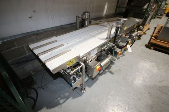 STI S/S Conveyor, with 4-Lane Aprox. 7" W Infeed Conveyor, with Table Top Single Filer, Aprox. 7-1/2" W Opening, with (5) Leeson S/S Clad Drives, Mouned on S/S Frame (IN#68740)(LOCATED IN MDG AUCTION SHOWROOM--PITTSBURGH, PA) (Rigging, Loading & Site Management Fee $200.00)