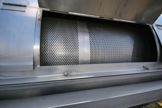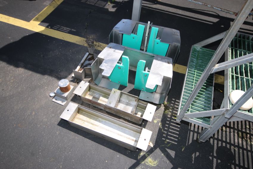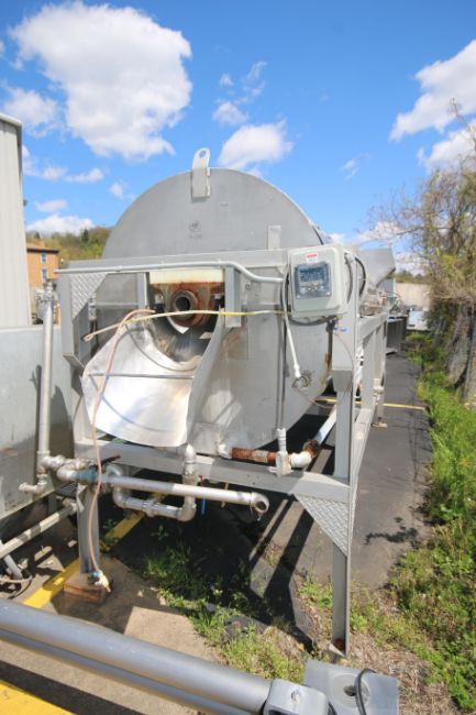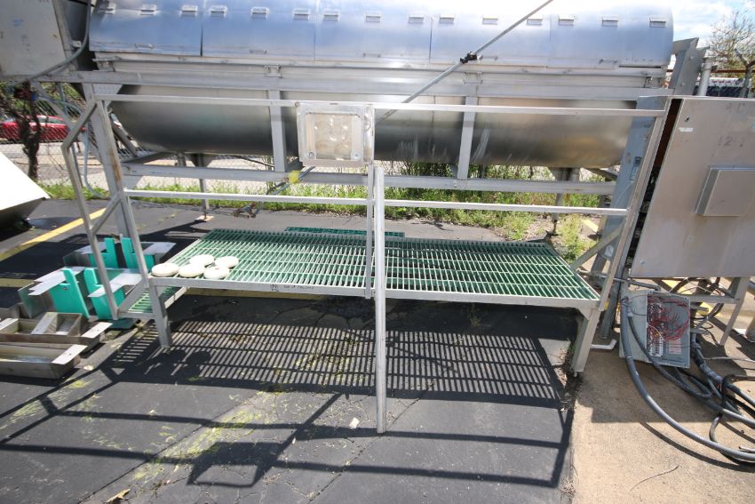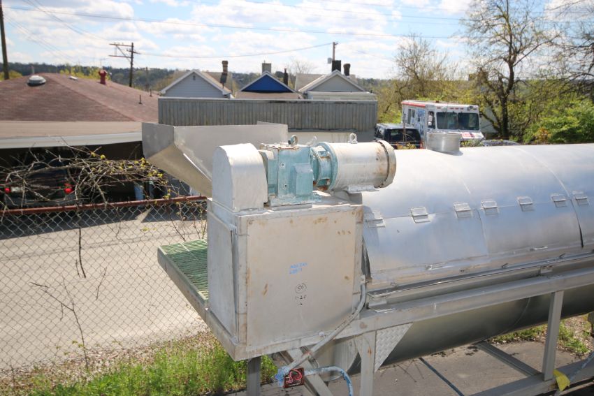 S/S Blancher, with Includes Leeson 5 hp S/S Clad Motor, Top Mounted, with S/S Infeed & Outfeed Chute, with Aprox. 13' " x 52" Dia. S/S Blanching Chamber, Overall Dims.: Aprox. 17' L x 5' W x 96" H, with S/S Pllatform with Plastic Grating, with Control Panel (NOTE: Controls Missing in Control Panel--See Photographs) (IN#68813)(LOCATED IN MDG AUCTION SHOWROOM--PITTSBURGH, PA) (Rigging, Handling & Site Management Fee: $1,000.00)