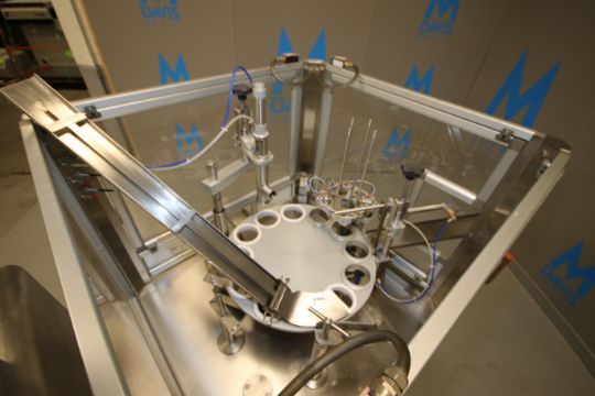 2010 Technogel 12-Station S/S Rotary Cup Filler, Machine Type: ROTARY 4000 ELETTRONICA, S/N R1058N/01E, 220 Volts, 3 Phase, with Aprox. 3-1/2" Dia. Cup Holsters with S/S Feed Chutes & Discharge Chutes, with (2) Totes of Assorted Change Parts, Mounted on S/S Portable Frame (IN#69501) (LOCATED AT M. DAVIS GROUP AUCTION SHOWROOM--PITTSBURGH, PA) (Rigging, Handling & Site Management Fee: $300.00)