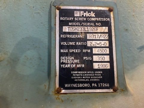 Frick 500 hp Rotary Ammonia Screw Compressor, Model/Serial No.: TDSH233L1926F, Refrigerant: R717/R22, Volume Ratio: 2.2-5.0, Max. Speed RPM: 4,500, Design Pressure: 350 PSIG, Year of MFG: 1996 (Located in Harrodsburg, KY) (Rigging, Handling & Site Management Fees $850.00)