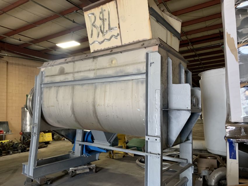 Stainless Steel Ribbon Blender 160 Cubic Feet with SS hopper on mild steel legs. 25HP Electric Motor with a FALK gear box 17.50 gear ratio (100 RPM output) running a chain drive gear reduction to about 25 final rpm. It was refurbished for a discontinued project. Will require a drop deck truck for transportation -- (LOCATED IN IOWA, RIGGING INCLUDED WITH SALE PRICE) -- Optional $750 Palletizing fee required. ***EUSA***