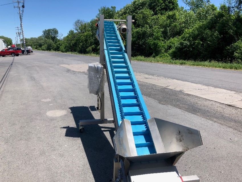 Weighpack 13/16" Inclined Infeed Conveyor, S/N 2323 on Casters, All S/S, Gathering Hopper 24 x 20 Catch Pan Under PVC Belting, 1 hp Motor with Gerbox, Variable Speed E Stop, Start, Stop Electrical Panel, 220 V, Single Phase(Located Port Byron, NY)