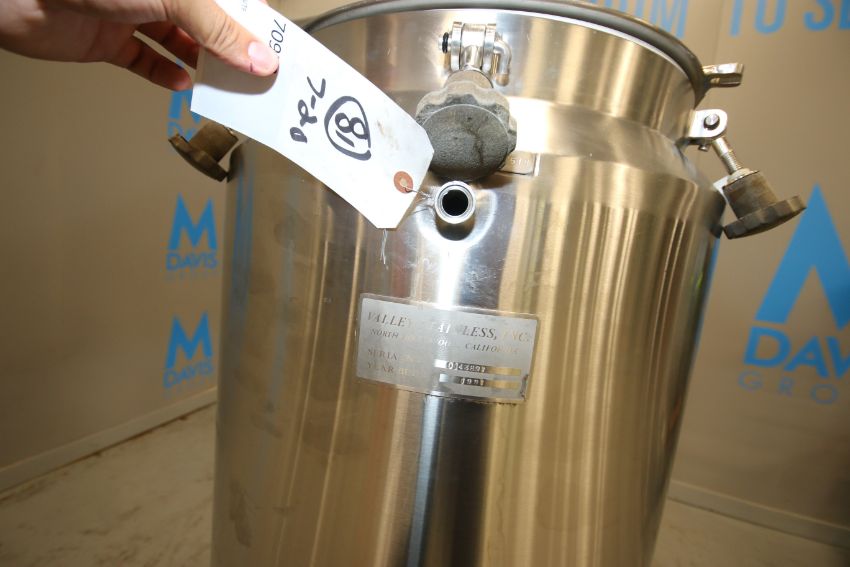 Valley Aprox. 35 Gal. S/S Jacketed Vertical Tank, S/N 9143891, with S/S Pressure Lid, Mounted on S/S Legs (IN#70973)(LOCATED AT M. DAVIS GROUP AUCTION SHOWROOM--PITTSBURGH, PA) (Rigging, Handling & Site Management Fee: $50.00)
