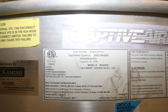 Captive-Aire Commercial High Speed Upblast Exhaust Fan, M/N NCA16FA, 208 Volts, 3 Phase (IN#70531)(LOCATED AT MDG AUCTION SHOWROOM--PGH., PA) (Rigging, Handling & Site Management Fee: $50.00)